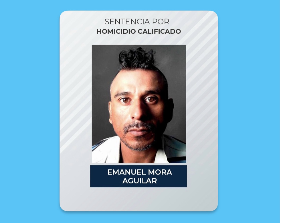 La Fiscalía General del Estado, con las pruebas presentadas por el Ministerio Público, logró que se le impusiera pena de prisión por 40 años a Emanuel Mora Aguilar, quien resultó responsable del delito de homicidio calificado en número de dos.