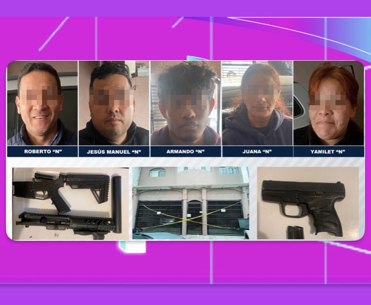 Durante el cateo al inmueble aseguraron a cinco personas, tres hombres y dos mujeres: Armando “N”, Juana “N”, Jesús Manuel “N”, Roberto “N” y Yamilet “N”, además se aseguró una mochila negra en cuyo interior se encontraba un arma de fuego larga sin cargador, sin marca o modelo visible, la cual se encontraba desarmada en tres piezas, así como también se encontró una pistola color negro calibre 9 milímetros, con cargador desabastecido.