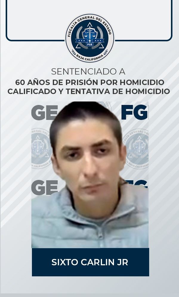 La Fiscalía General del Estado informa que, a través de un juicio oral, se obtuvo una sentencia de 60 años de prisión para Sixto Carlin Jr., a quien se le responsabilizó de los delitos de homicidio calificado con ventaja y homicidio calificado en su ejecución de tentativa.