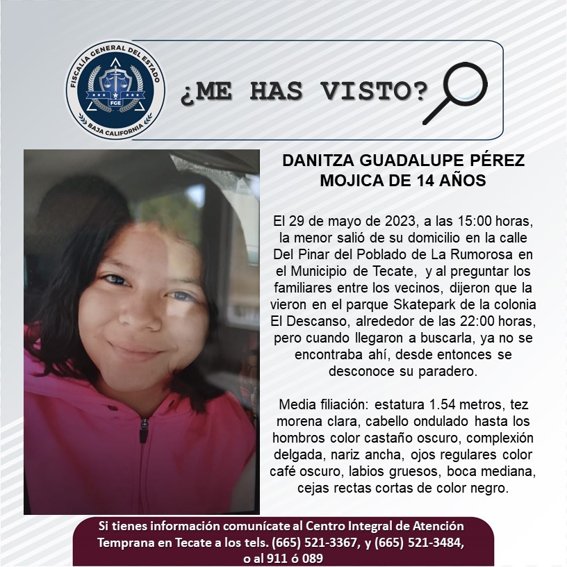 La Fiscalía General del Estado (FGE), solicita el apoyo de la ciudadanía para localizar a Danitza Guadalupe Pérez Mojica de 14 años de edad.