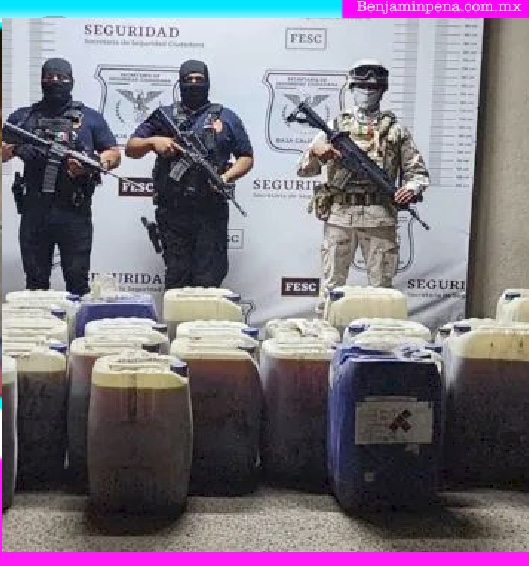 En la caja metálica de la camioneta se encontraron 45 bidones de 50 litros cada uno, con un líquido cuyas características corresponden a la droga sintética conocida como metanfetamina, motivo por el cual se procedió al aseguramiento inmediato para posteriormente poner a disposición de la Fiscalía General de la República (FGR), autoridad correspondiente en llevar a cabo las debidas diligencias.