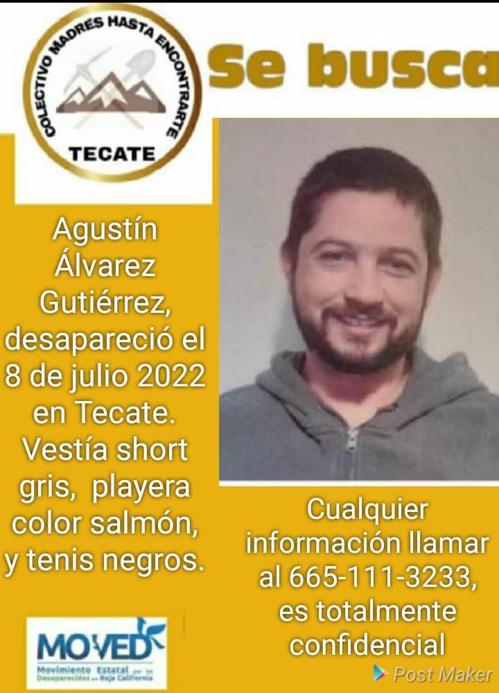 Familiares y amigos piden ayuda de la comunidad para encontrar a Agustín Álvarez Gutiérrez,- quien fue visto por última vez salir de su domicilio en Tecate el 8 de julio en un Pick up FORD Ranger blanco modelo, 2011, Placas: 92427R1 son americanas.