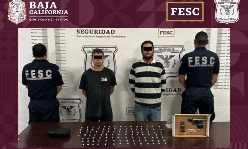Dos hombres armados, quienes también tenían en su poder más de cien envoltorios con la droga sintética metanfetamina, fueron detenidos por agentes de la Fuerza Estatal de Seguridad Ciudadana (FESC), luego de que se informara a la autoridad vía denuncia anónima en el número 089, sobre las actividades ilícitas que se encontraban desarrollando ambos sujetos en el municipio de Tecate.