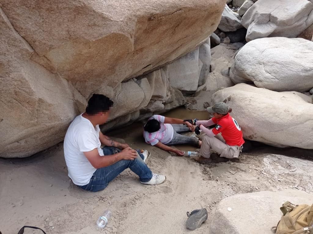 Después de varias horas, los especialistas en protección, rescate y auxilio de migrantes encontraron a las dos personas resguardándose de la temperatura bajo una pierda. Los agentes de Grupo Beta verificaron su estado de salud y los hidrataron de inmediato con agua y suero vida oral.