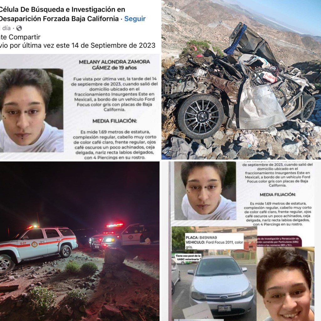 La Célula De Búsqueda e Investigación en Desaparición Forzada Baja California confirmó en redes sociales que Melany Alondra Zamora Gámez de 19 años de edad originaria de Mexicali, es la joven que fue localizada sin vida este martes dentro de un vehículo que se accidentó y cayó a un barranco, en el tramo ascendente de la carretera Mexicali-La Rumorosa.