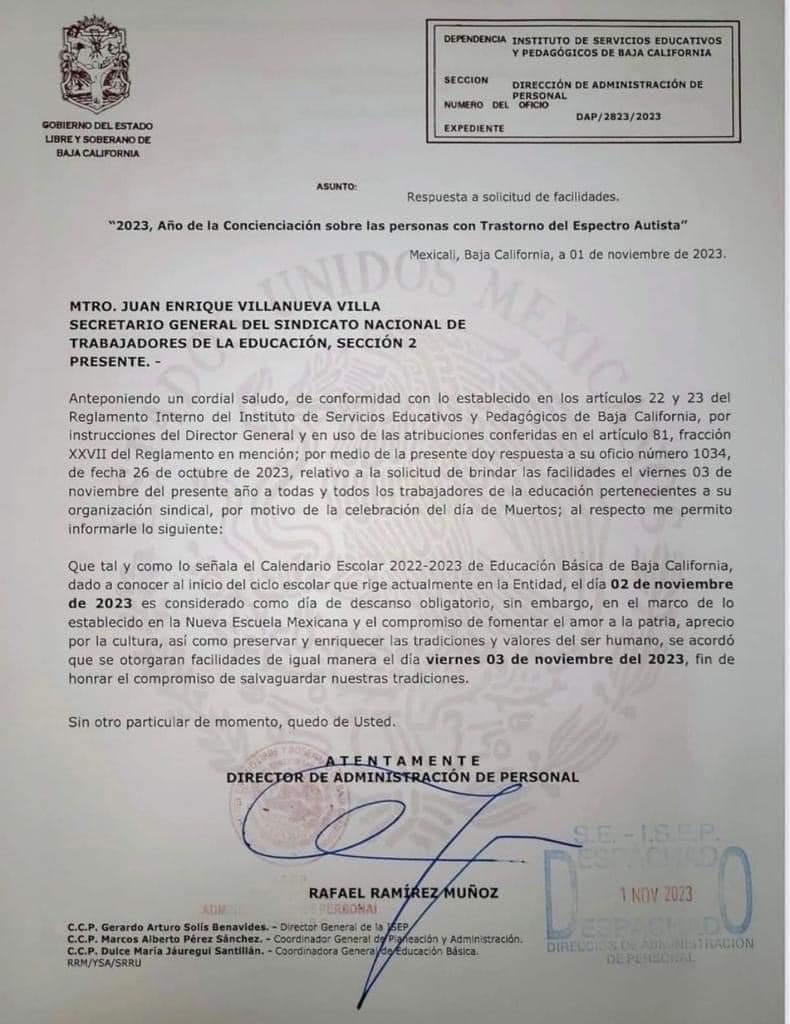 1 de noviembre de 2023 Benjaminpenamx HABRÁ PUENTE ESCOLAR en BAJA CALIFORNIA Suspenden clases en el nivel básico los días 2 y 3 de Noviembre por la celebración del Día de Muertos. Comparte esto: Compartir en X (Se abre en una ventana nueva) X Comparte en Facebook (Se abre en una ventana nueva) Facebook Me gusta Cargando...