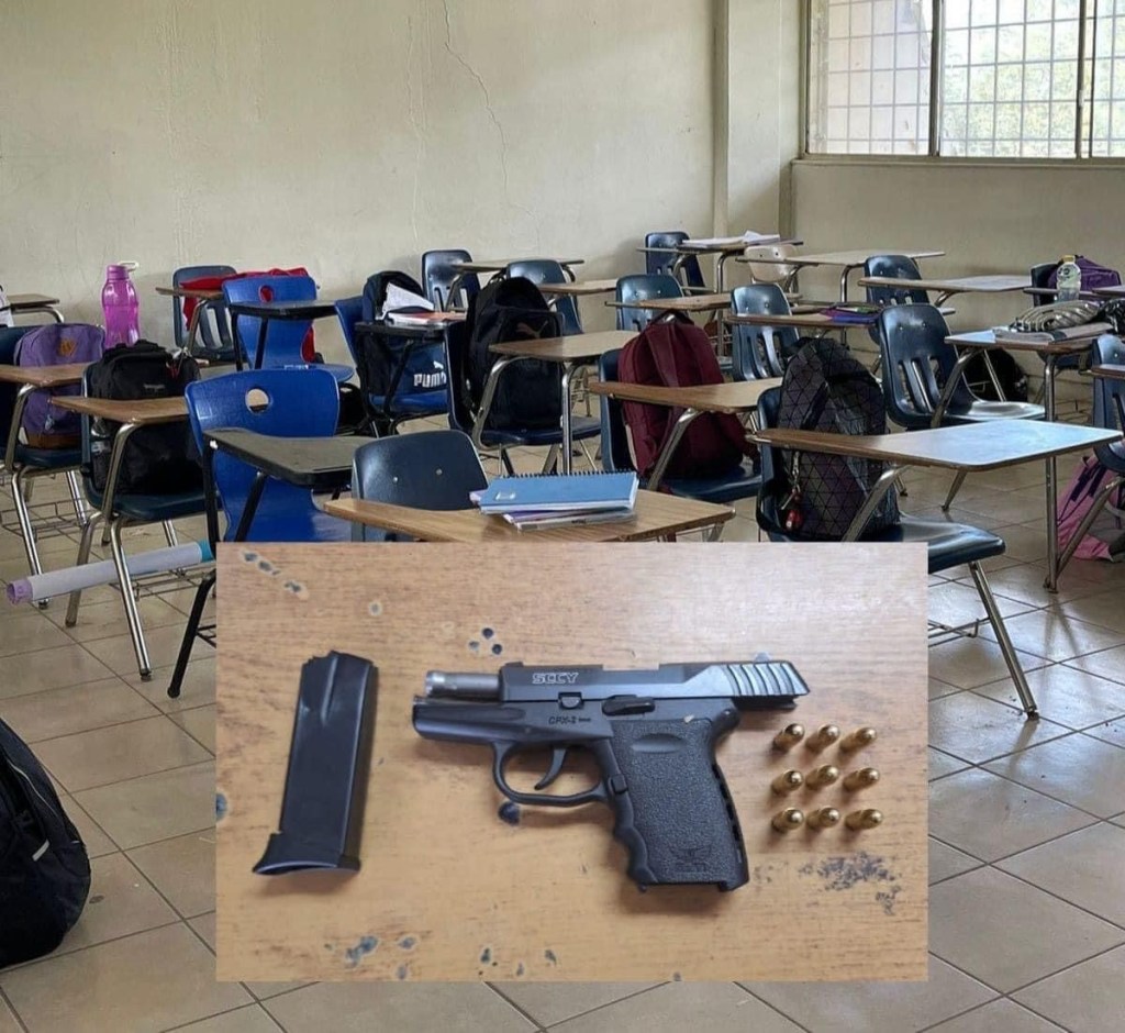 De acuerdo a los primeros indicios, estudiantes señalaron a un compañero quien llevaba un arma tipo pistola oculta entre su ropa, por lo que personal docente acompañado por oficiales de seguridad pública realizaron la intervención al estudiante al interior de una de las aulas, tras la inspección precautoria se localizó el arma de fuego calibre 9mm, con cargador abastecido con 9 cartuchos útiles.