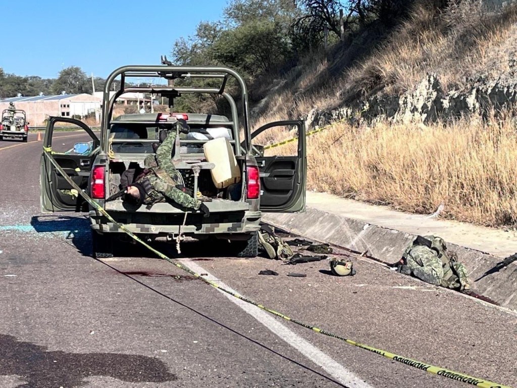 📍Los militares fueron emboscados por 3 vehículos blindados cuando realizaban un patrullaje en Teocaltiche, Jalisco.