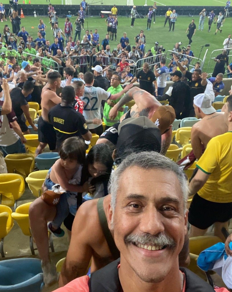 En un momento de tensión entre aficionados de Brasil y Argentina en el encuentro de eliminatorias mundialistas en el #Maracaná, un aficionado ya está dando la vuelta al mundo tras esta selfie en medio del problema.