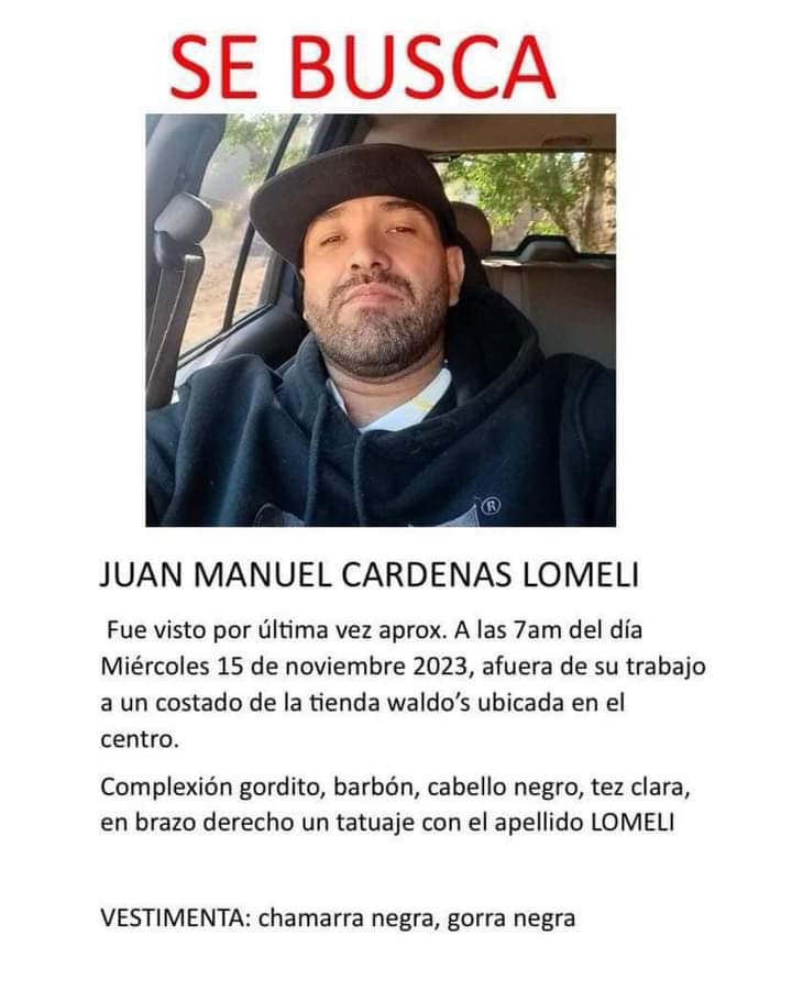 📍Fue visto por última vez aprox. A las 7am del día Miércoles 15 de noviembre 2023, afuera de su trabajo a un costado de la tienda waldo’s ubicada en el centro.