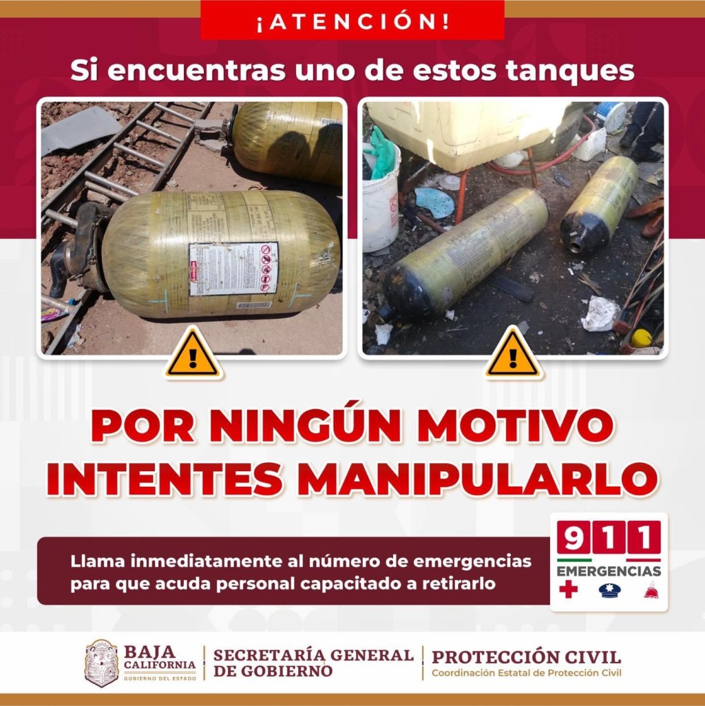 La coordinación Estatal de Protección Civil hace un llamado a la población a reportar al 911 estos tanques americanos y, sobre todo, a no manipularlos bajo ninguna circunstancia.