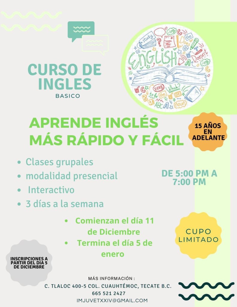 📍El Instituto de la Juventud invita al curso de inglés que tendrá una duración de 4 semanas.