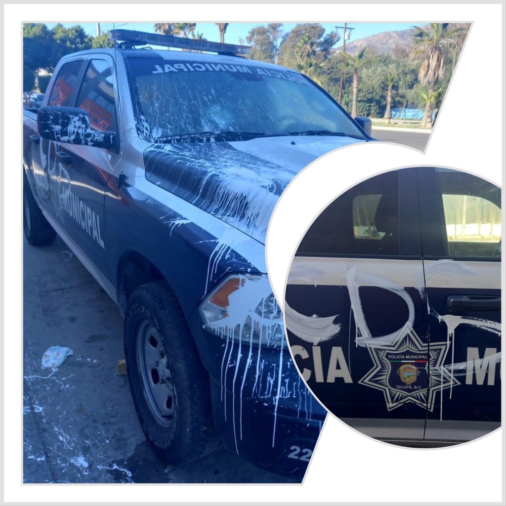 Una patrulla de la Policía Municipal fue grafiteada este viernes sobre el bulevar Benito Juárez, dicha unidad se encuentra en reparación en un taller mecánico.