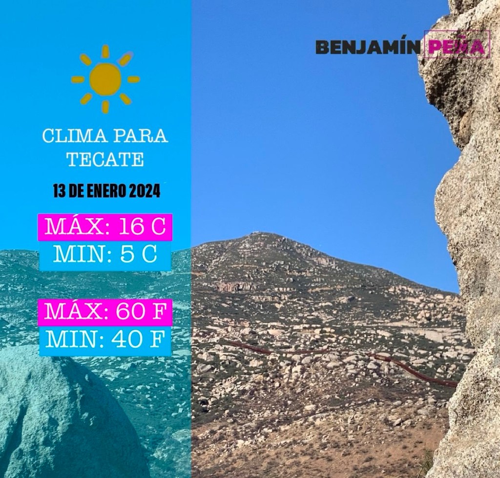 13 de enero de 2024 Benjaminpenamx TECATE || PRONÓSTICO DEL TIEMPO ☀️soleado 🗓️domingo 14 de enero del 2024 🌡️máxima 16°C 🌡️mínima 5°C 🌡️máxima 60°F 🌡️mínima 40°F Comparte esto: Compartir en X (Se abre en una ventana nueva) X Comparte en Facebook (Se abre en una ventana nueva) Facebook Me gusta Cargando...