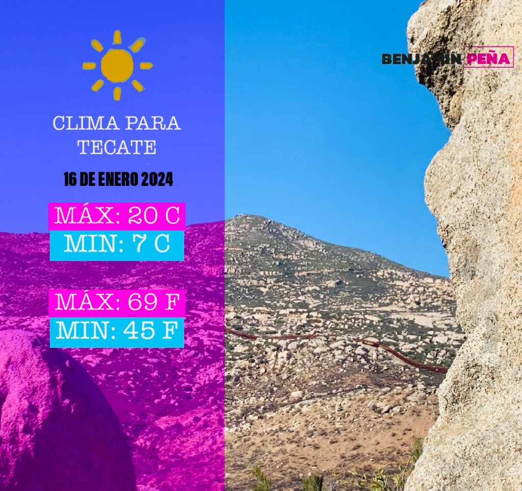 15 de enero de 2024 Benjaminpenamx TECATE || PRONÓSTICO DEL TIEMPO ☀️soleado 🗓️martes 16 de enero del 2024 🌡️máxima 20°C 🌡️mínima 7°C 🌡️máxima 69°F 🌡️mínima 45°F Comparte esto: Compartir en X (Se abre en una ventana nueva) X Comparte en Facebook (Se abre en una ventana nueva) Facebook Me gusta Cargando...