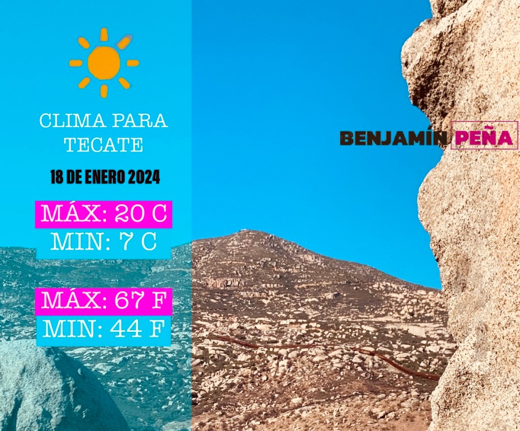 17 de enero de 2024 Benjaminpenamx TECATE || PRONÓSTICO DEL TIEMPO ☀️soleado 🗓️jueves 18 de enero del 2024 🌡️máxima 20°C 🌡️mínima 7°C 🌡️máxima 67°F 🌡️mínima 44°F Comparte esto: Compartir en X (Se abre en una ventana nueva) X Comparte en Facebook (Se abre en una ventana nueva) Facebook Me gusta Cargando...