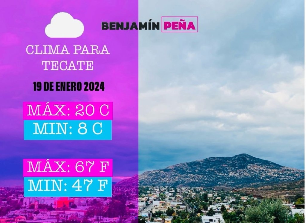 18 de enero de 2024 Benjaminpenamx TECATE || PRONÓSTICO DEL TIEMPO ☁️nublado 🗓️viernes 19 de enero del 2024 🌡️máxima 20°C🌡️mínima 8°C 🌡️máxima 67°F🌡️mínima 47°F Comparte esto: Compartir en X (Se abre en una ventana nueva) X Comparte en Facebook (Se abre en una ventana nueva) Facebook Me gusta Cargando...