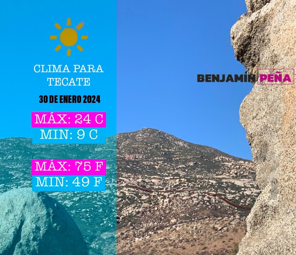29 de enero de 2024 Benjaminpenamx TECATE || PRONÓSTICO DEL TIEMPO PARA EL 30 DE ENERO 2024 ☀️ soleado 🌡️máxima 24°C 🌡️mínima 9°C 🌡️máxima 75°F 🌡️mínima 49°F Comparte esto: Compartir en X (Se abre en una ventana nueva) X Comparte en Facebook (Se abre en una ventana nueva) Facebook Me gusta Cargando...