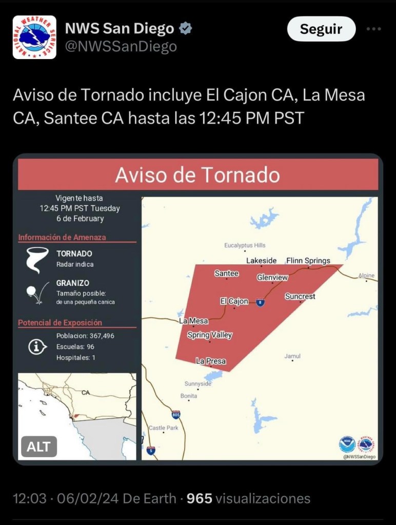 El NWS emitió una advertencia de tornado para el sureste de San Diego en Chula Vista, El Cajon, National City, La Mesa, Tierrasanta, Santee, Lemon Grove, Encanto, Rancho San Diego, La Presa, Paradise Hills, Lincoln Park, College East, Lake Murray, Spring Valley, Rolando, Crest, Lakeside, Bonita y Mountain View hasta las 12:45 p.m.