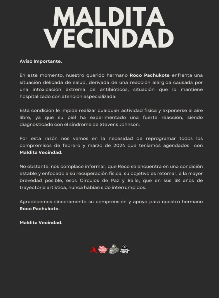 📍Roco Pachukote, vocalista de la Maldita Vecindad, fue hospitalizado, por lo que la agrupación pospuso las presentaciones previstas durante febrero y marzo.