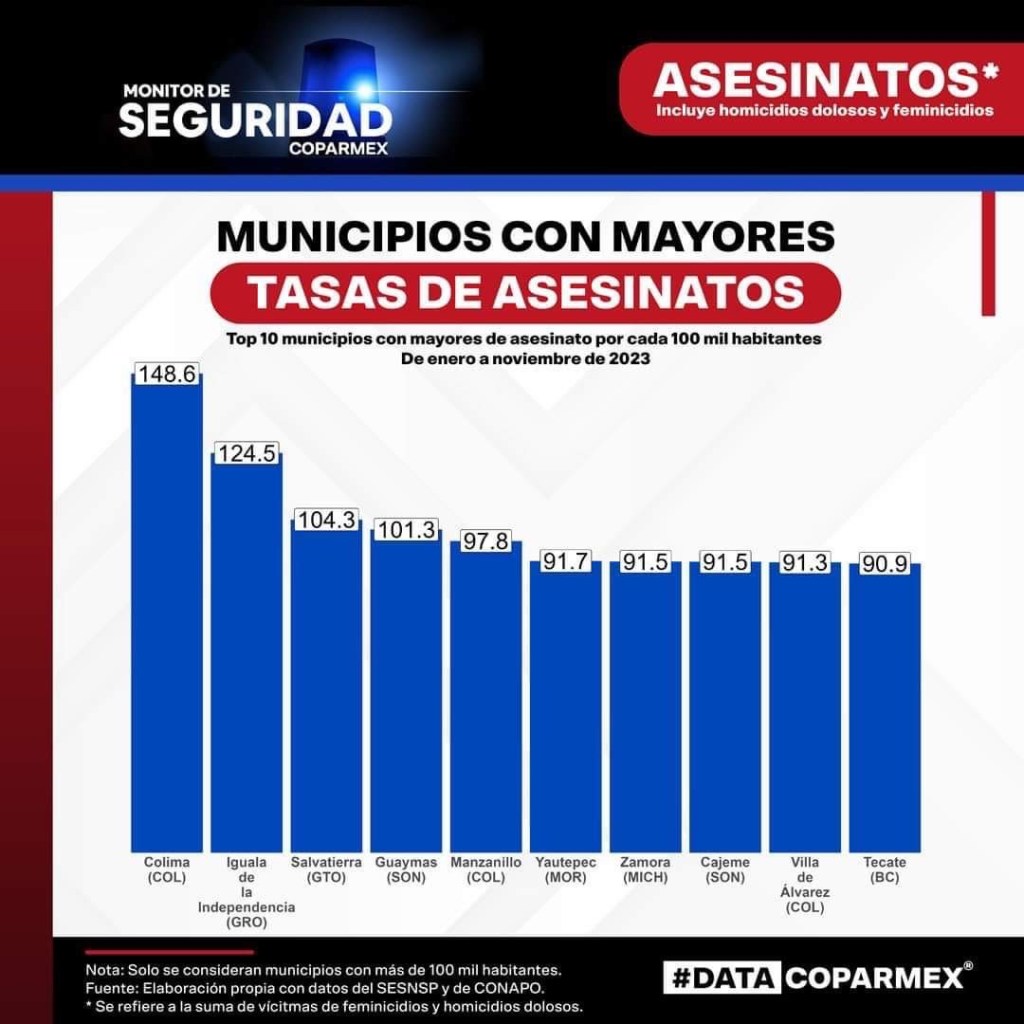 La estadística muestra que por cada 100mil habitantes, en esos 10 municipios se concentra el 7% de los asesinatos registrados en 2023 a nivel nacional.