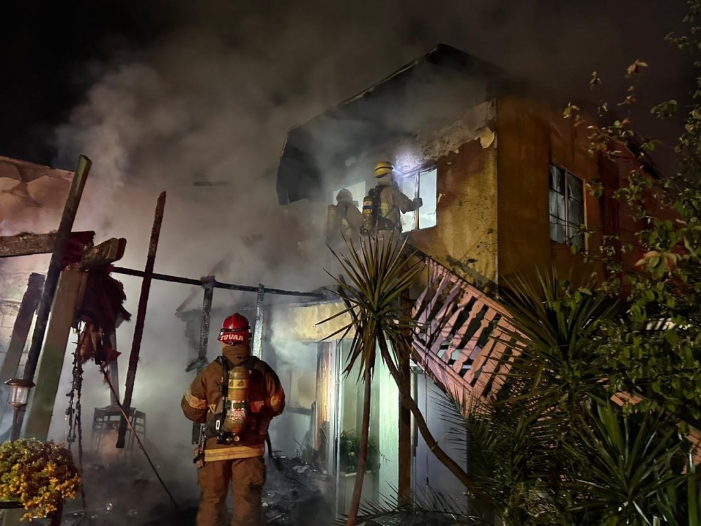 La coordinación municipal de Protección Civil y Bomberos atendió incendio estructural a las 3:15 Hrs se recibe reporte sobre av encino #1472 colonia bella vista en el lugar una casa habitada de segundo nivel involucrada.