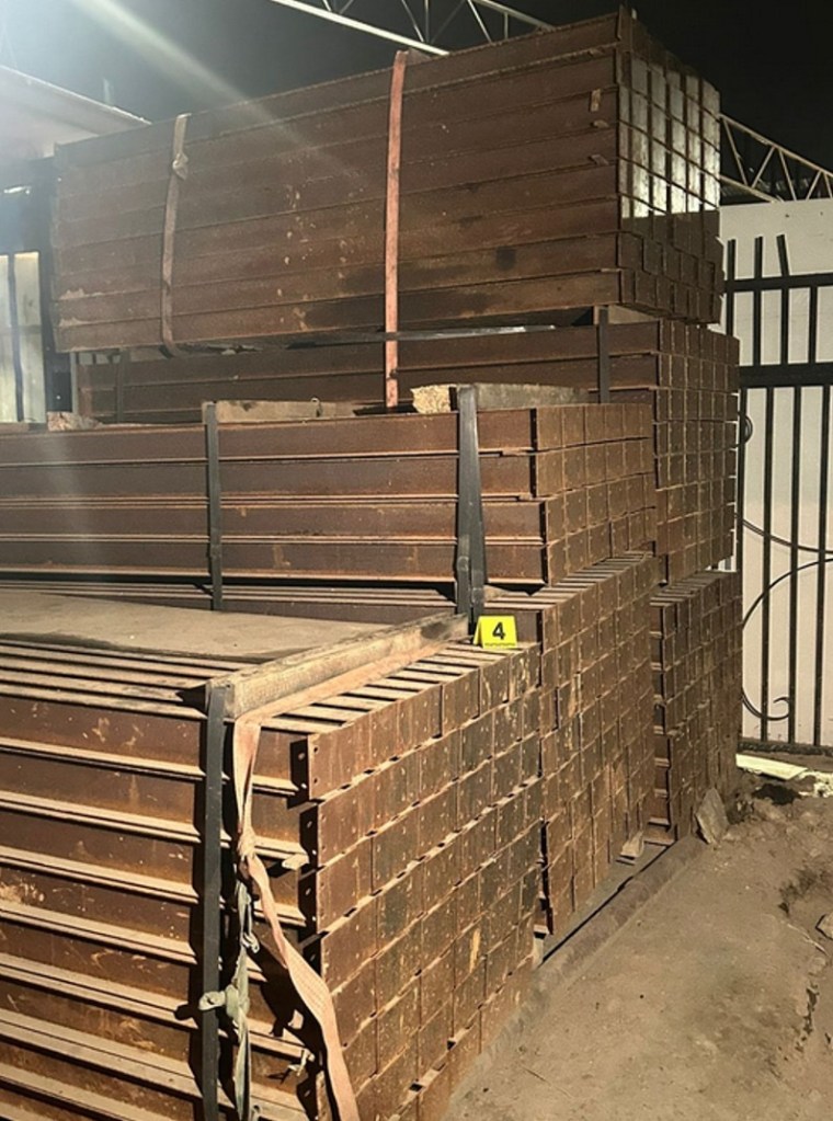 Como resultado, se logró asegurar los siguientes objetos relacionados con los hechos que se investigan: 1,429 travesaños de acero (vigas) de marca Marshall Steel Ing con la leyenda HT, todos de medidas 2.58 metros de largo por 10 centímetros de alto y 13 centímetros de ancho, 8 ensambles de chasis (patines metálicos) con la leyenda HT421L.G3.17.157, 4 empaques de vigas, así como el aseguramiento de un DVR de marca Saxxon.