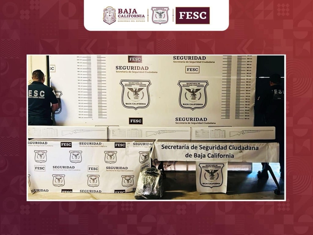 Agentes de la Fuerza Estatal de Seguridad Ciudadana (FESC) aseguraron cuatro armas de fuego abastecidas con cartuchos útiles, dos chalecos antibalas y un vehículo con reporte de robo; estos resultados forman parte de tres despliegues operativos realizados en el municipio de Tecate, logrando además, en dos de los incidentes la detención de presuntos delincuentes.