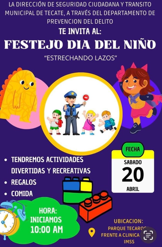 La Dirección de Seguridad Ciudadana y Tránsito Municipal de Tecate, a través de su Depto. de Prevención del Delito invita a las niñas y niños de Tecate entre los 0-12 años de edad a FESTEJAR EL DÍA DE LA NIÑEZ.