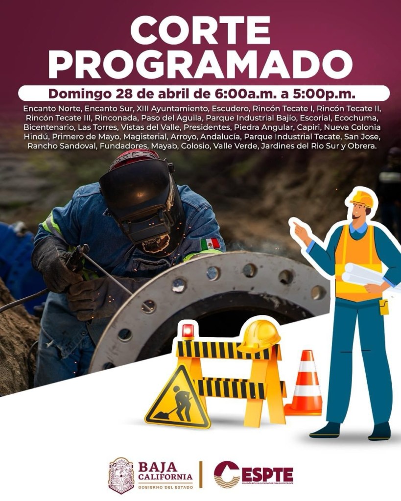 📍Las colonias que presentarán pausa en el suministro de agua potable serán: Encanto Norte, Encanto Sur, XIII Ayuntamiento, Escudero, Rincón Tecate I, Rincón Tecate II, Rincón Tecate III, Rinconada, Paso del Águila, Parque Industrial Bajío, Escorial, Ecochuma, Bicentenario, Las Torres, Vistas del Valle, Presidentes, Piedra Angular, Capiri, Nueva Colonia Hindú, Primero de Mayo, Magisterial, Arroyo, Andalucía, Parque Industrial Tecate, San Jose, Rancho Sandoval, Fundadores, Mayab, Colosio, Valle Verde, Jardines del Rio Sur y Obrera.