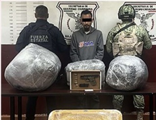 De manera coordinada la Fuerza Estatal de Seguridad Ciudadana (FESC) y la Secretaría de la Defensa Nacional (SEDENA), detuvieron en el municipio de Tecate a un hombre al que le aseguraron poco más de 40 kilogramos de marihuana y un arma de fuego, luego de que se protagonizara una persecución por varias calles de la colonia Militar; el detenido fue puesto a disposición de la Fiscalía General de la República (FGR).
