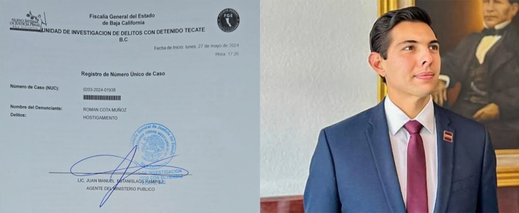Román Cota Muñoz, candidato de la coalición Sigamos Haciendo en Baja California (MORENA, Partido Verde y Fuerza por México) a la Presidencia Municipal de Tecate, presentó una denuncia por Hostigamiento, amenazas, intimidación, difamación, calumnias y lo que resulte ante la Fiscalía General del Estado (FGE) contra el alcalde Darío Benítez, por amenazas y difamación.