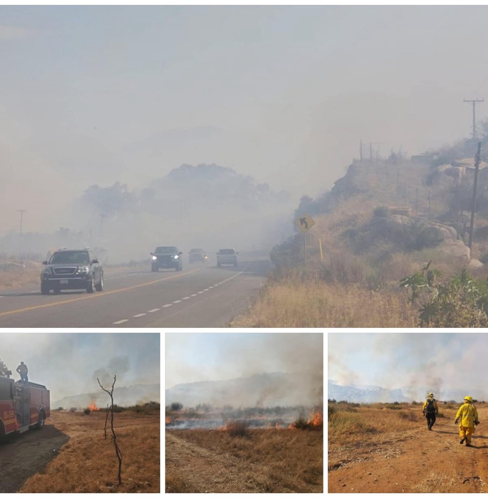 📍La coordinación municipal de Protección Civil y Bomberos trabaja en incendio activo sobre km 11.5 carretera Tecate- Ensenada a la altura de rancho El Chale, el incendio se encuentra activo con dirección sureste, así mismo la visibilidad es nula sobre la carretera.