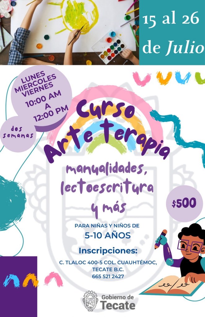 Comprometidos con el desarrollo integral de los jóvenes, el Instituto Municipal de la Juventud de Tecate (IMJUVET), da a conocer su nuevo curso de “Arte Terapia” que se llevará a cabo del 15 al 26 de julio de 2024.