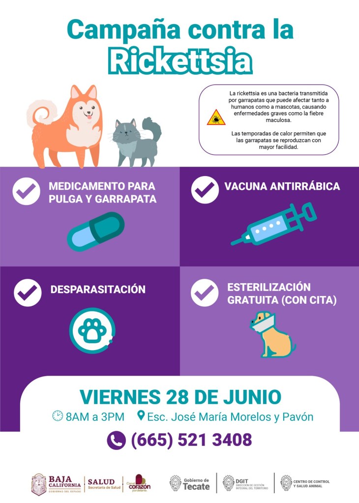 El Gobierno Municipal de Tecate en coordinación con la Secretaría de Salud del Estado de Baja California (ISESALUD), invitan a la Jornada de Vacunación y Esterilización este 28 de junio de 8:00 de la mañana a 3:00 de la tarde en la Escuela José Ma. Morelos y Pavón de la colonia Bellavista.