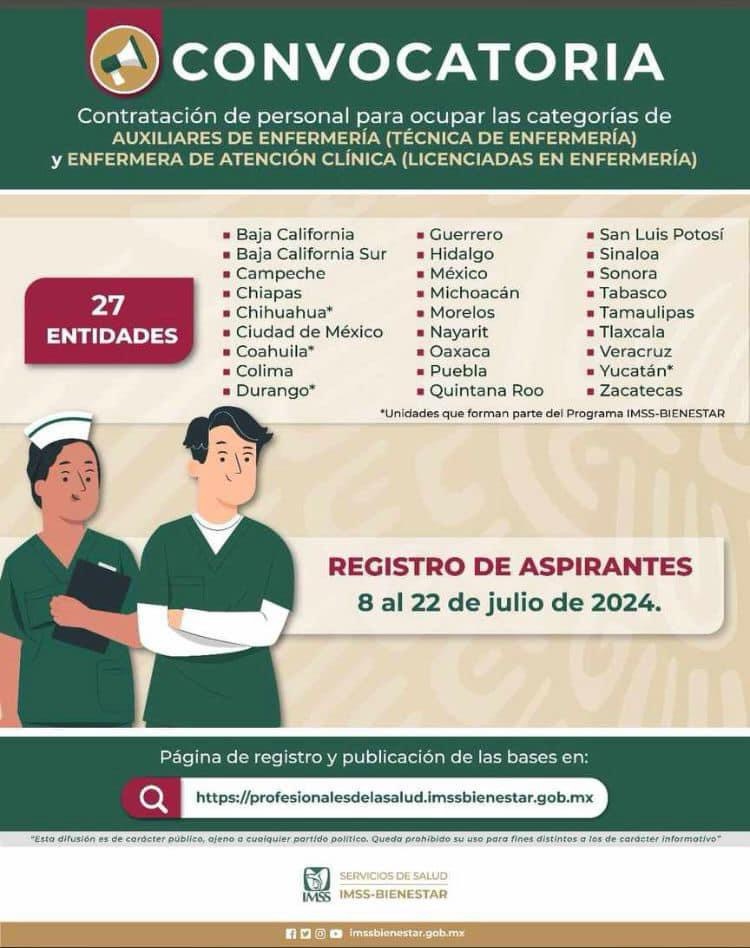 2 de julio de 2024 Benjaminpenamx CONVOCATORIA Abierta para contratación de Auxiliares de enfermería y Enfermería Clínica Del 8 al 22 de Julio del 2024 Registro en: https//profesionalesdelasalud.imssbienestar.gob.mx Comparte esto: Compartir en X (Se abre en una ventana nueva) X Comparte en Facebook (Se abre en una ventana nueva) Facebook Me gusta Cargando...