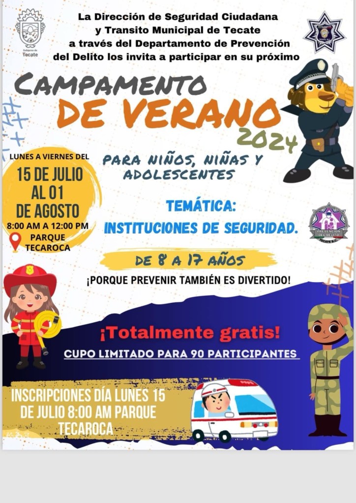 El Departamento de Prevención del Delito perteneciente a la Dirección de Seguridad Ciudadana y Tránsito Municipal de Tecate a cargo de la Mtra. Elsa Macías Vázquez 🚓Invita a niños,niñas y adolescentes al Plan Vacacional de Verano🌞🤗🚓