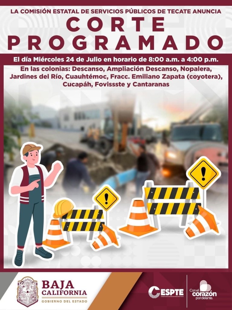 🦺Por trabajos de reparación de acueducto de 18 pulgadas en col. el Descanso entre bulevar Luis Donaldo Colosio y calle San Valentín.