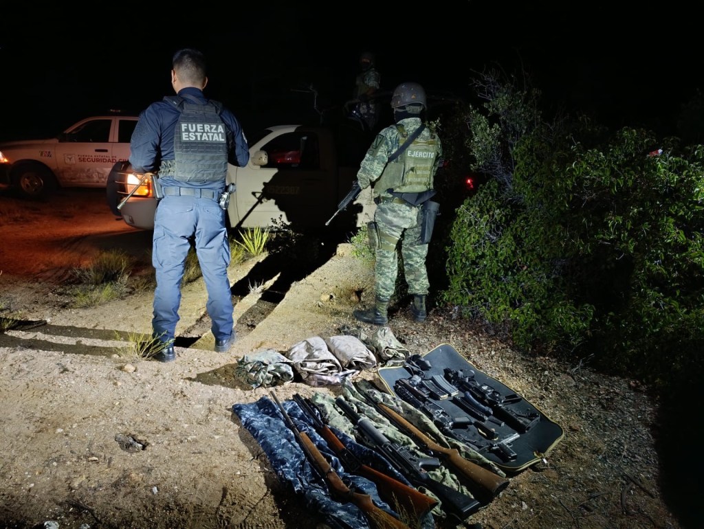 📍FUE LA NOCHE DEL MARTES 06 DE AGOSTO SOBRE UN CAMINO VECINAL DEL POBLADO DE LA RUMOROSA QUE CONDUCE AL CAMPO EÓLICO, FUERZA ESTATAL Y SEDENA LOCALIZARON Y DECOMISARON UN ARSENAL Y EQUIPO TÁCTICO: