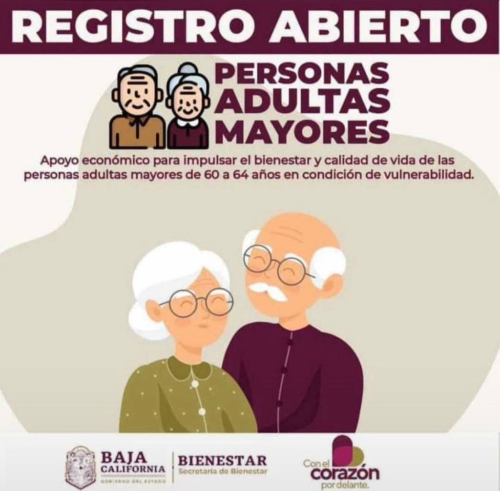 Registro abierto del lunes 12 al viernes 23 de agosto para el Apoyo para Personas Adultas Mayores, de la Secretaría de Bienestar de Baja California.