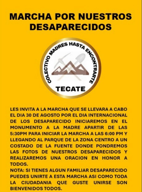 27 de agosto de 2024 Benjaminpenamx TECATE || FAMILIAS MARCHARÁN POR SUS DESAPARECIDOS 📍ES EN EL MARCO DEL DÍA INTERNACION POR LOS DESAPARECIDOS 🗓️30 DE AGOSTO 2024⏰5:30PM📍PARTEN DEL MONUMENTO A LA MADRE Comparte esto: Compartir en X (Se abre en una ventana nueva) X Comparte en Facebook (Se abre en una ventana nueva) Facebook Me gusta Cargando...