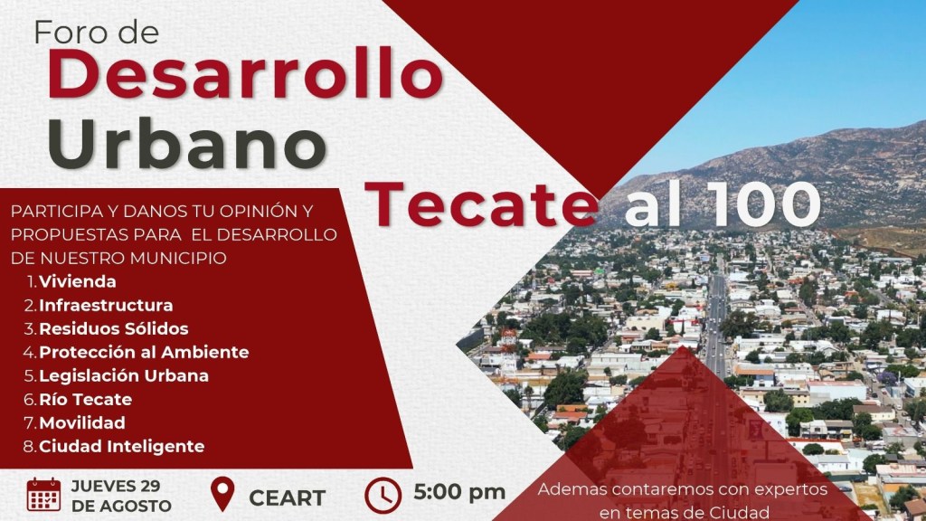 Con el objetivo de construir los planes y programas que implementará el XXV Ayuntamiento de Tecate en materia de infraestructura, el alcalde electo de Tecate, Román Cota Muñoz, invitó a la comunidad al foro de participación ciudadana en materia de desarrollo urbano ¡Tecate al 100! el próximo jueves 29 de agosto a las 17:00 horas en el Centro Estatal de las Artes de Tecate.
