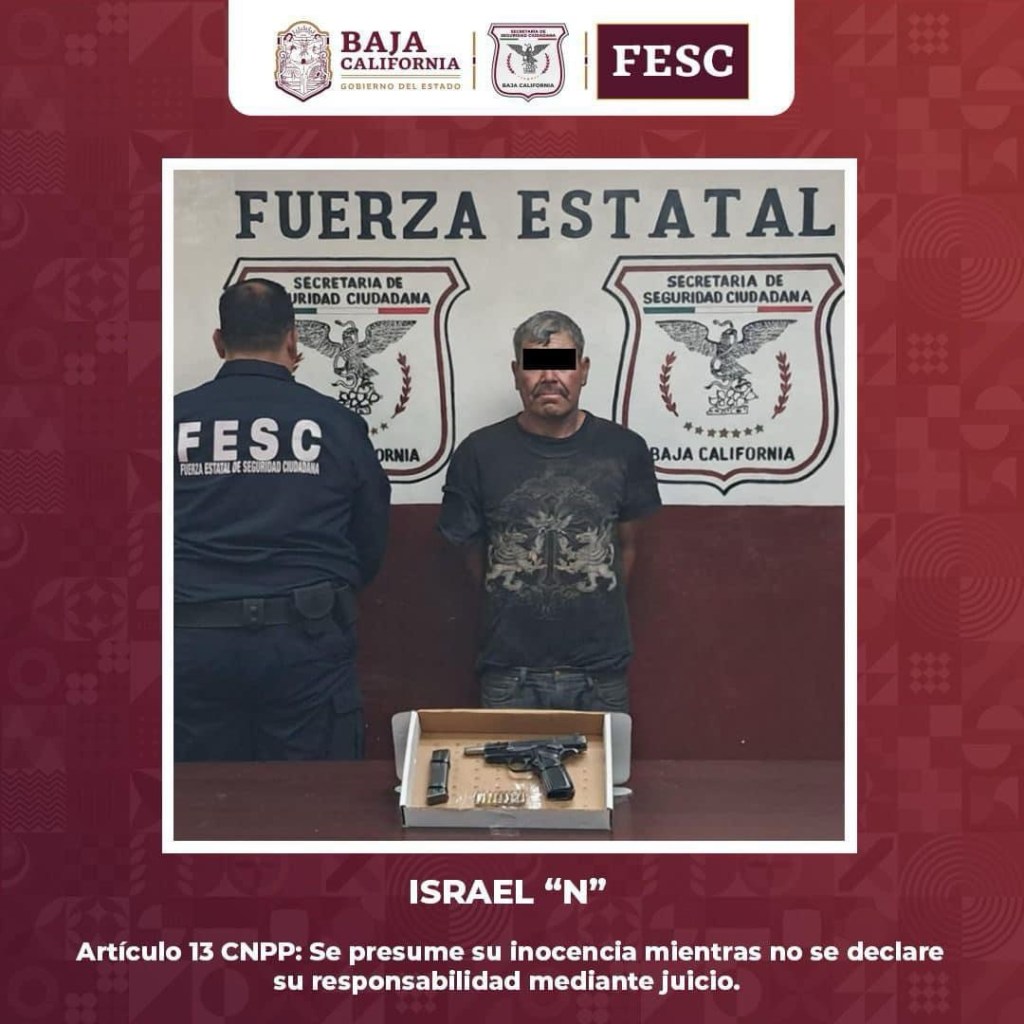 En el Poblado de La Rumorosa, gracias a un reporte ciudadano se concretó la detención de quien se identificó como Israel “N”, de 46 años y originario de Tepic, Nayarit; el individuo en mención tenía fajada en la zona de la cintura un arma de fuego tipo pistola de calibre .9 MM, con un cargador abastecido con 9 cartuchos útiles, también de calibre .9 MM.