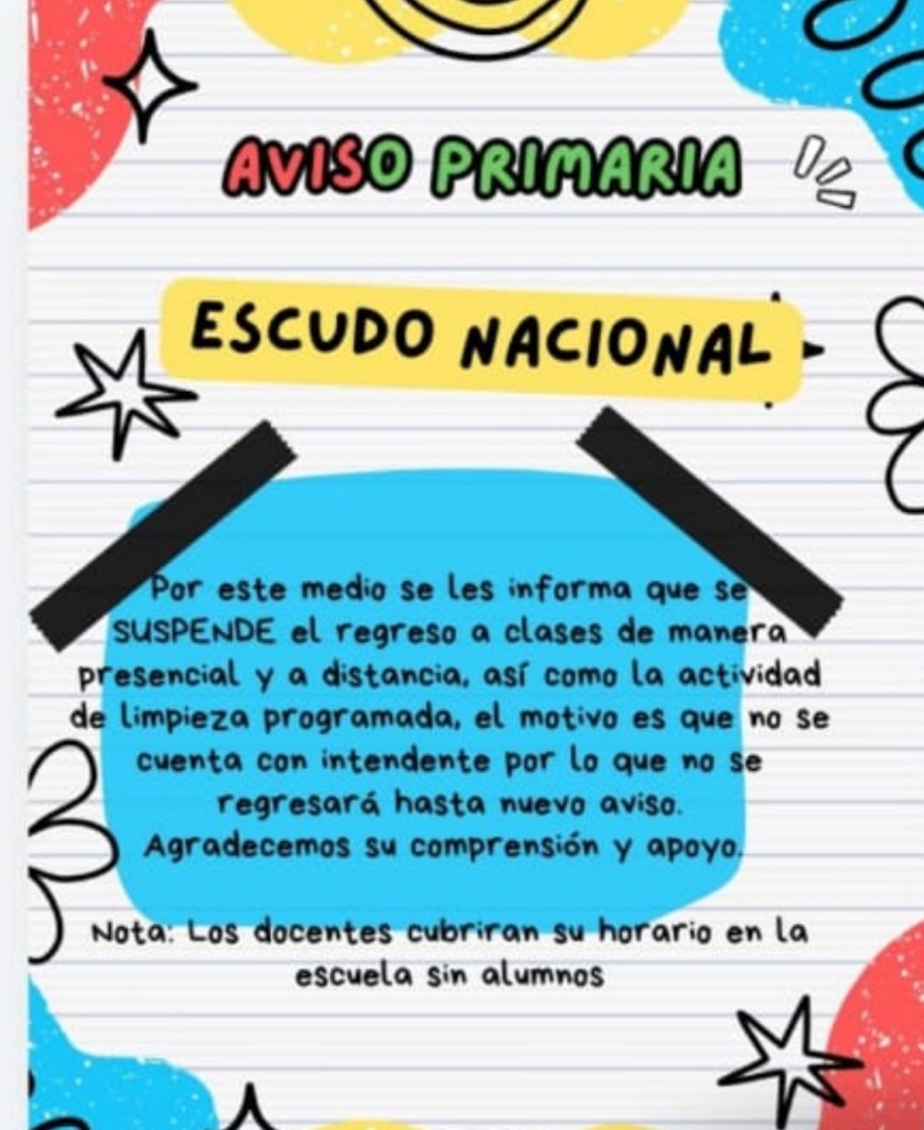SUSPENDE el regreso a clases de manera presencial y a distancia, así como la actividad de Limpieza programada, el motivo es que no se cuenta con intendente por lo que no se regresará hasta nuevo aviso.