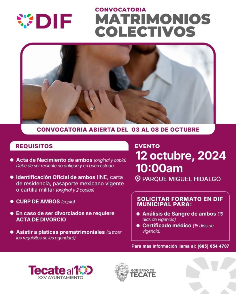 En ese sentido, se extiende cordialmente la invitación a todas las parejas interesadas en formalizar legalmente su relación, a participar en la convocatoria de recepción de documentos que se encontrará abierta a partir de este jueves 3 hasta el martes 8 de octubre en las instalaciones de DIF Municipal, aprovechando este incentivo que condona el pago de derechos por el acta de matrimonio.