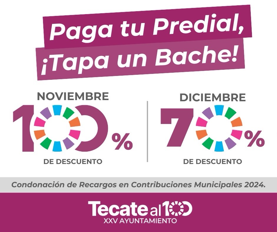 El Gobierno Municipal de Tecate, encabezado por el alcalde Román Cota Muñoz, informa a la comunidad sobre la campaña de condonación de recargos en contribuciones municipales correspondientes al año 2024. Durante el mes de noviembre, los contribuyentes podrán aprovechar un descuento del 100 por ciento en recargos, mientras que en diciembre se ofrecerá un descuento del 70 por ciento.