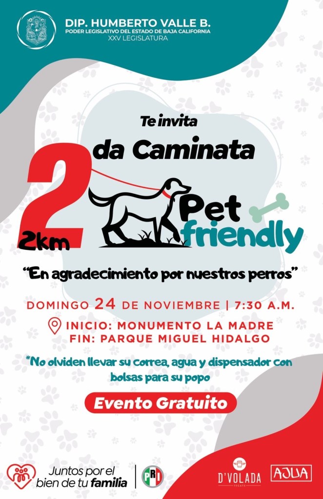 Este próximo domingo 24 de noviembre, en punto de las 7:30 de la mañana, se llevará a cabo la segunda caminata “PET-Friendly”, misma que dará inicio en el Monumento a la Madre para llegar a la meta en el Parque Miguel Hidalgo.
