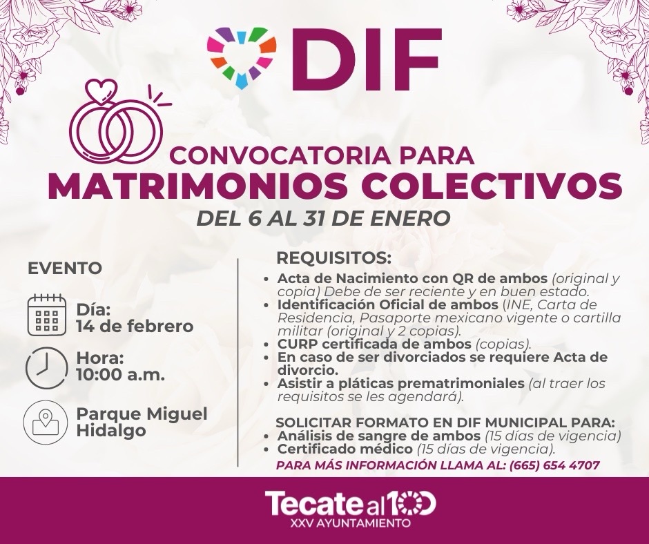 • _El próximo 14 de febrero se llevará a cabo la ceremonia de Matrimonios Colectivos totalmente gratis, por lo que DIF Tecate ha lanzado la convocatoria para recibir requisitos del 06 al 31 de enero._