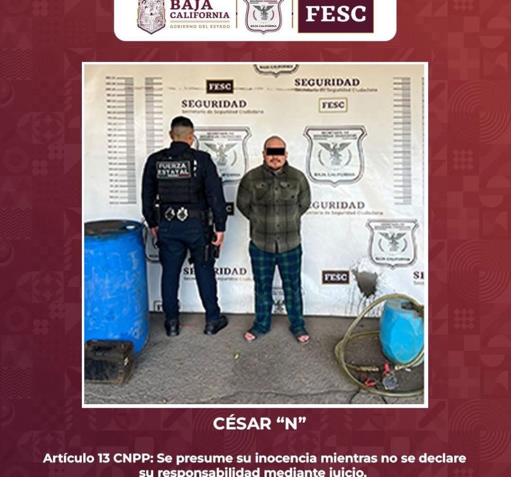 En otra acción coordinada también en la zona de Los Manantiales, se detuvo a César “N” originario de Tecate, a quien se le sorprendió rellenando un galón con lo que parecía ser gasolina; al aproximarse, los agentes confirmaron que el líquido eran hidrocarburos que estaban siendo manipulados de manera ilícita, razón por la que procedieron a la intervención