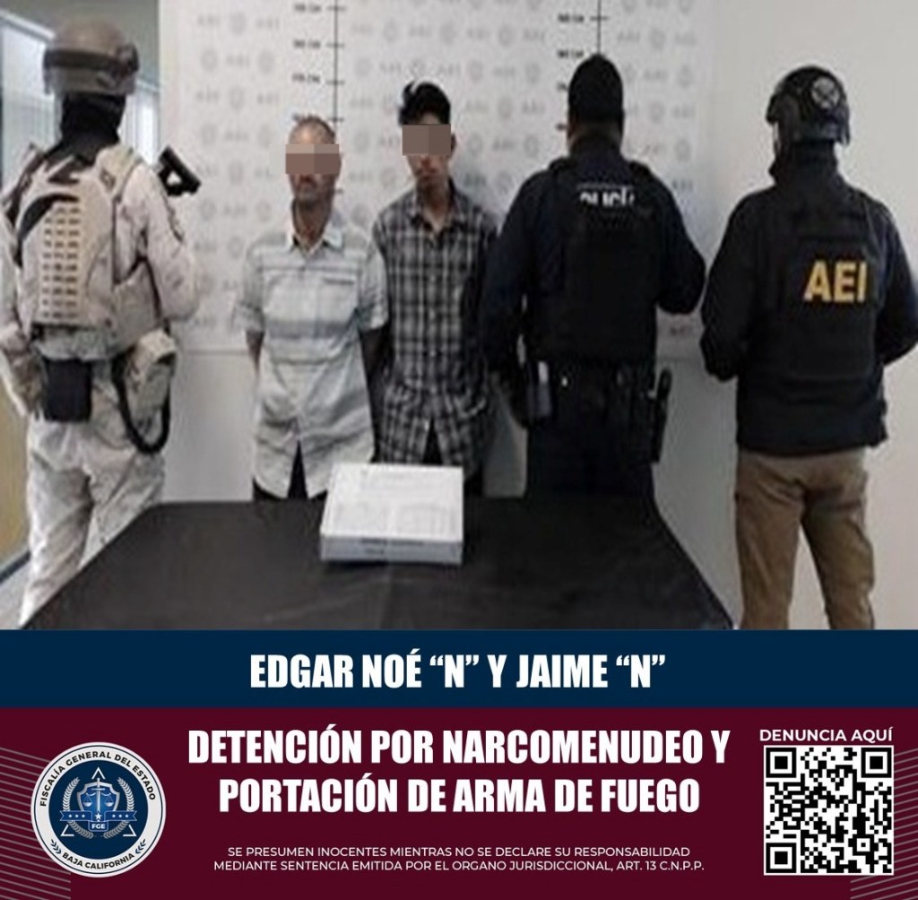 La Fiscalía General del Estado, a través de la Agencia Estatal de Investigación (AEI) Zona Tecate, informa sobre la exitosa detención de dos individuos en flagrancia, como resultado de un operativo conjunto con la Secretaría de la Defensa Nacional (SEDENA) y la Dirección de Seguridad Ciudadana y Tránsito Municipal.